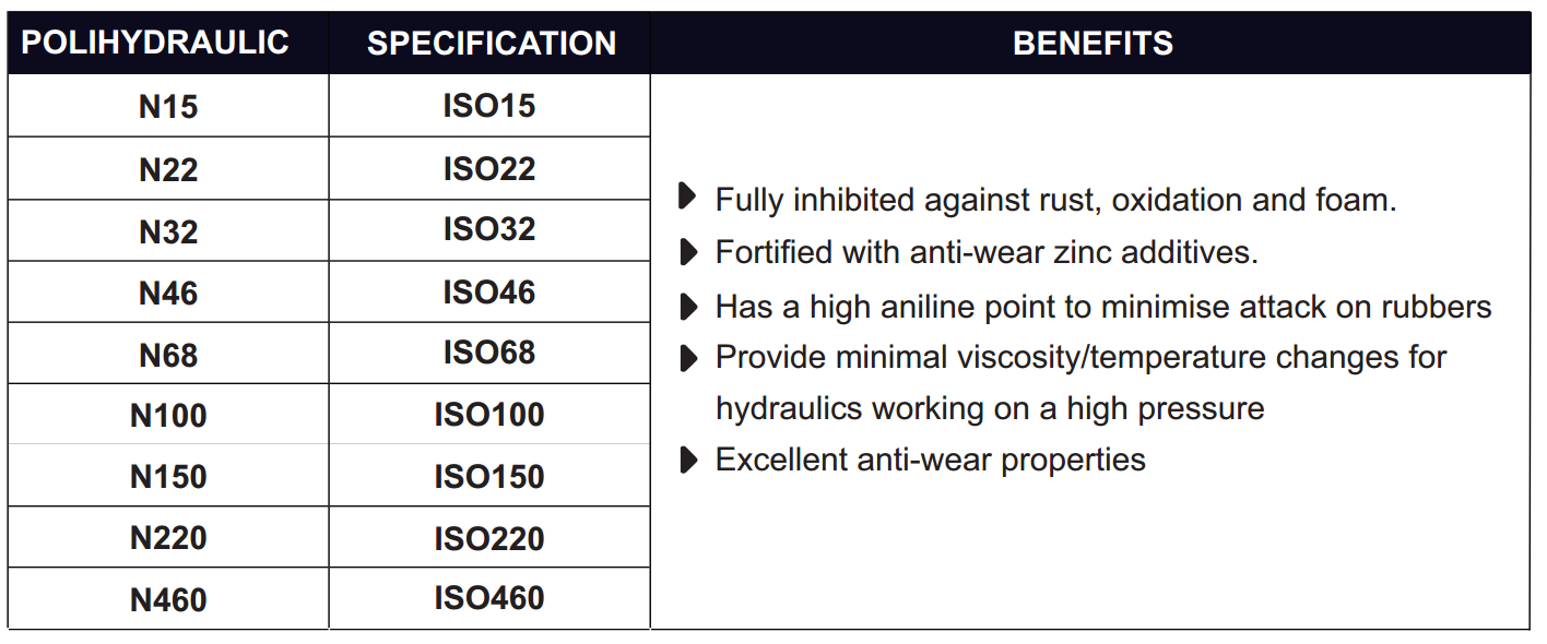 Polilube hydraulic oil is formulated with highly refined mineral base oils as supreme anti-wear hydraulic oil for wide temperature range application. Its exhibit optimum flow characteristics at sub-zero temperatures and are resistant to shearing and viscosity loss.